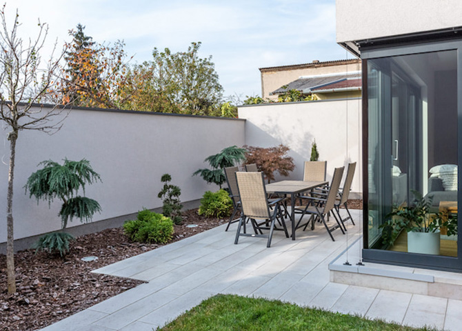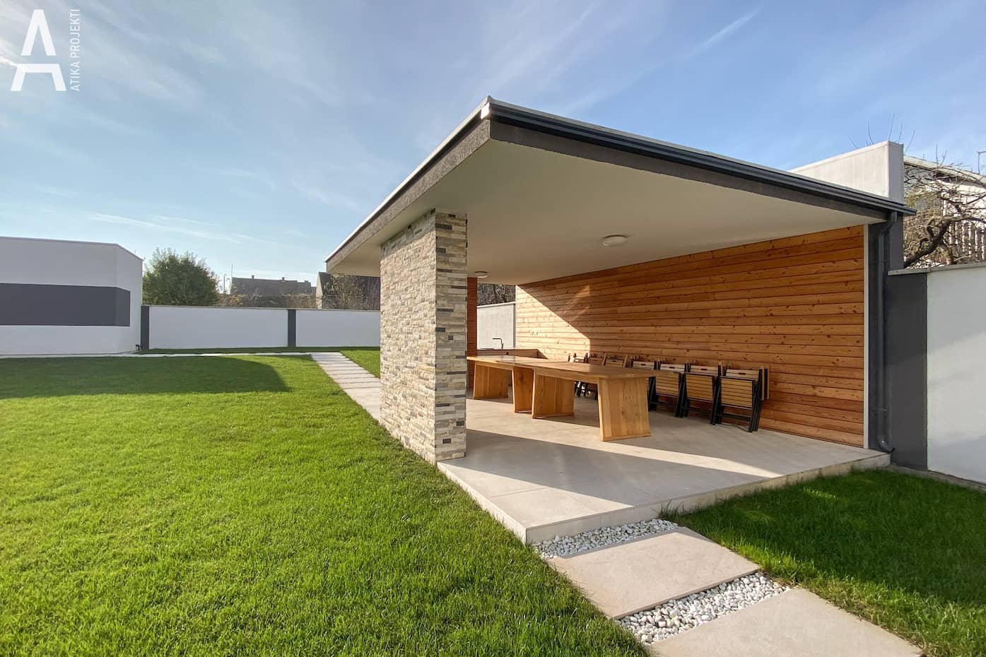 Uz objekt obiteljske kuće, na parceli su smještena i dva pomoćna objekta. Bliže kući smještena je nadstrešnica opremljena roštiljem i vanjskom kuhinjom, dok se na dnu parcele nalazi pomoćni spremišni objekt.