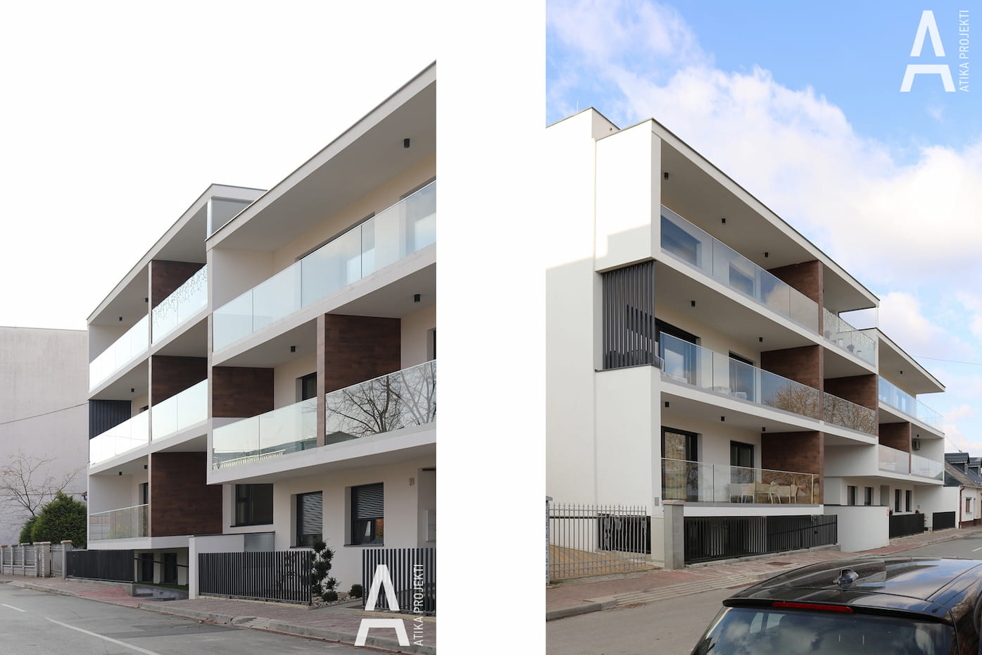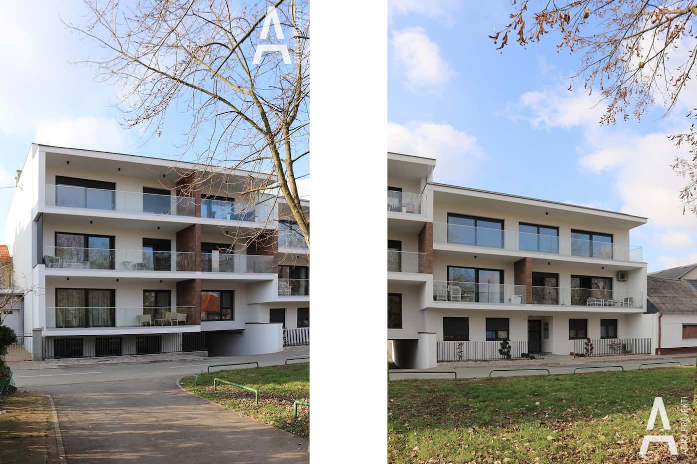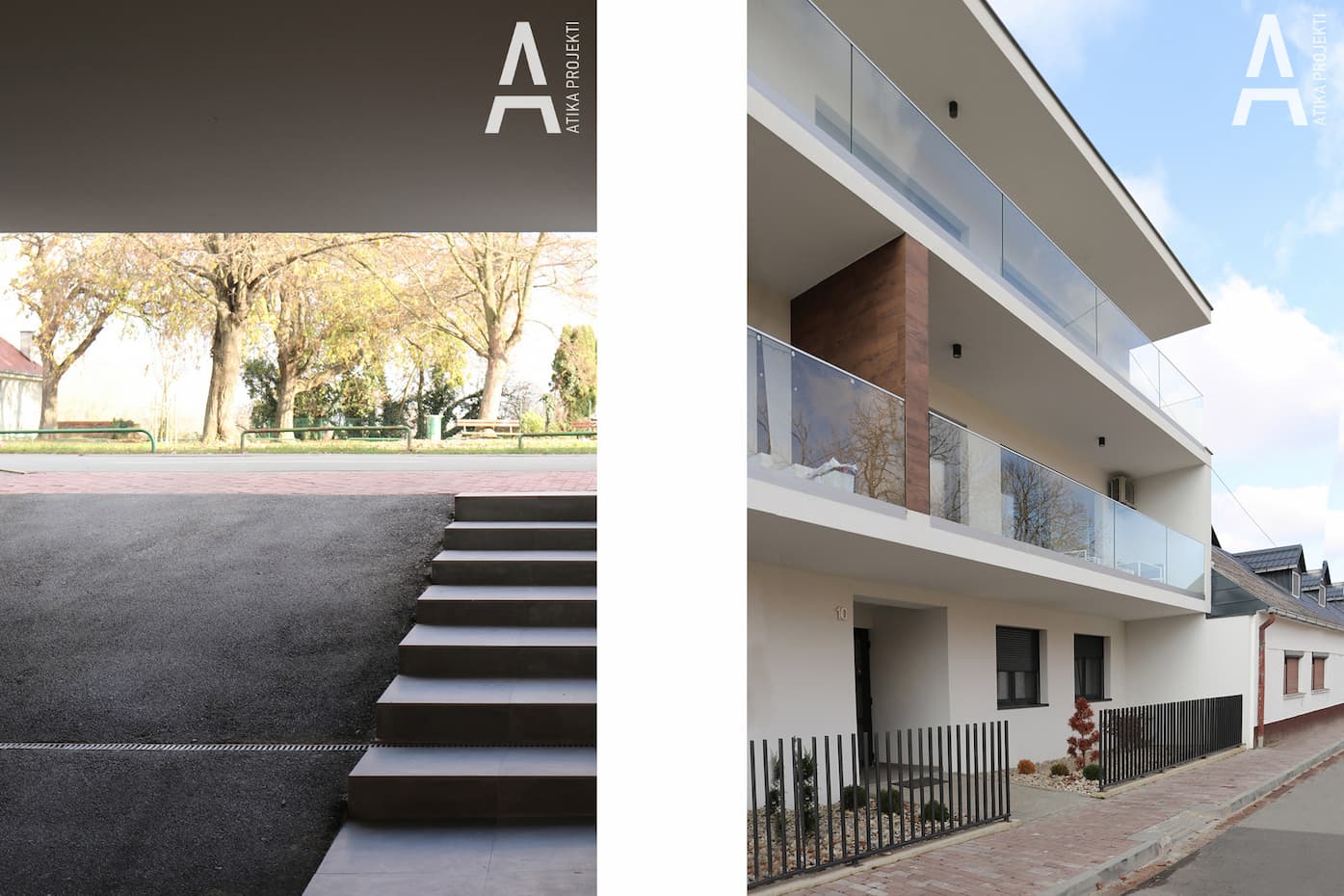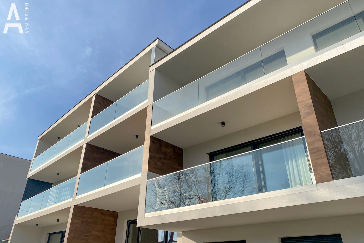 Višestambena zgrada smještena je na atraktivnoj lokaciji uz neposrednu blizinu rijeke Drave. Projektirana je kao ugrađeni objekt podijeljen u dvije dilatacije, od kojih se jedna sastoji od četiri, druga od tri etaže. Etaže su smaknute po visini čime je dobivena zanimljiva igra pročelja, koje se zbog naglašenih horizontala balkonskih istaka čita poput meandra.